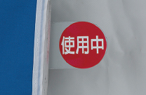 出入口カーテンを閉め内側からロックすると、連動して外部に「使用中」の表示が出ます。使用時は外部から入室できないよう取手は見えなくなります。